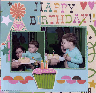 Когда увидела фотографии, сразу поняла, какие выберу и как будет выглядеть разворот, потому что за день до получения фотографий получили бумагу SEI из новой коллекции "Happy Day", и ее яркие дизайны как нельзя кстати пришлись к фотографиям. Старалась не перегружать объемными украшалками, только тортик и цветочек на объемном скотче. Под фото теги, на левой страничке с моими записульками, на правой - пустой для журналинга.