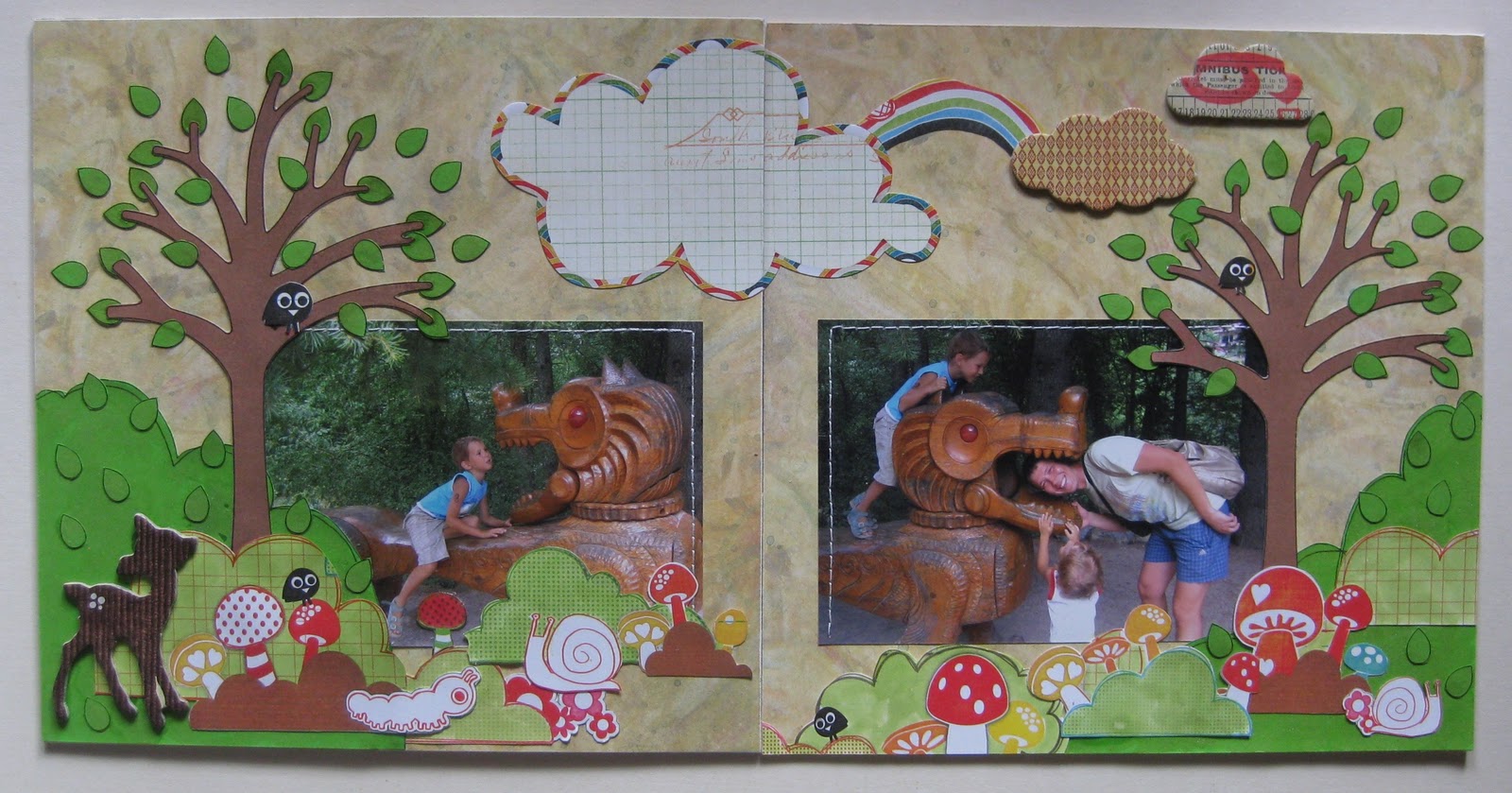 Получился вот такой задорный яркий разворот. Использовала бумагу K&Co, Sassafras Lass, Basic Grey, украшалки Sassafras, и много вырезала ножничками. Дерево нарисовано в кореле, распечатано и вырезано, листочки в т.ч. (их красила дистрессом и глиммер-мистом кисточкой).